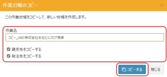 登録済みの作業台帳の内容をコピーして新規の作業台帳を作成します。 | |