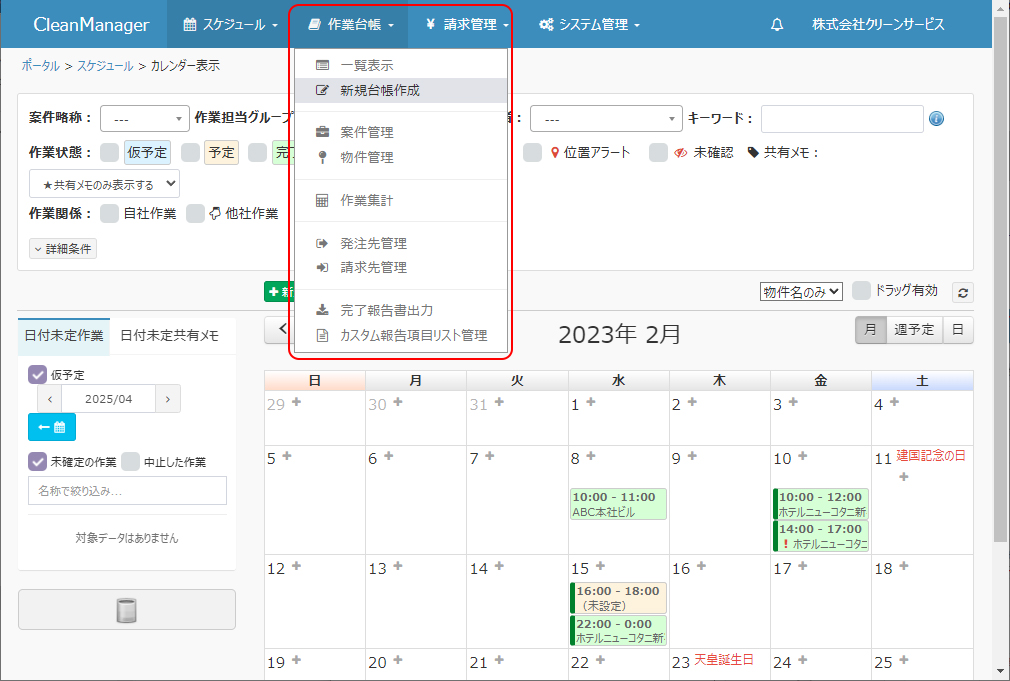 ①ヘッダーメニューより「作業台帳」→「新規台帳作成」を選択します。 | |||||||||||||||