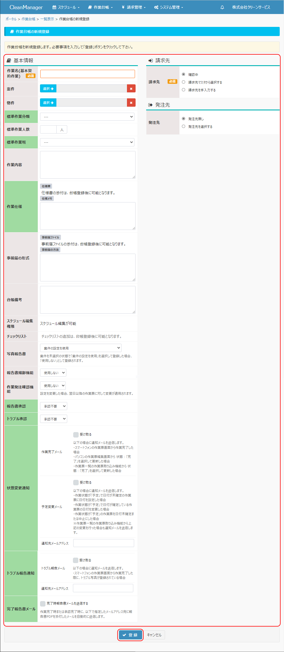 ② 作業台帳の新規登録画面が表示されます。各項目に作業の情報を入力し、「登録」ボタンをクリックします。 ※[必須]の表示がある項目は入力必須項目となります。空の状態では登録を行うことができません。 |
