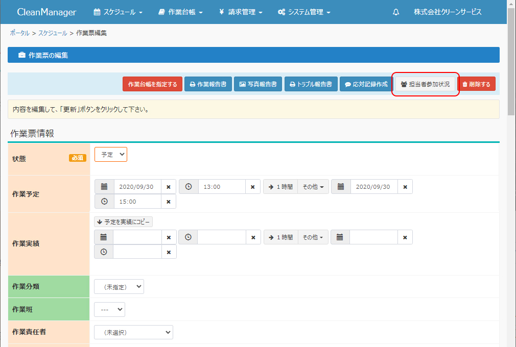 ①カレンダー画面、もしくは作業票一覧画面から担当者参加状況を登録したい作業票画面を開きます。 | |
