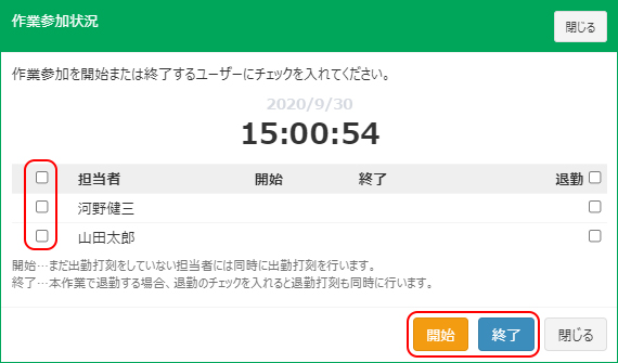 ③作業参加状況画面が表示されます。作業に中途参加する場合には作業参加を開始するユーザー行にチェックし、「開始」ボタンをクリックします。 また、作業の中途で離脱する場合には、離脱するユーザー行にチェックし、「終了」ボタンをクリックします。