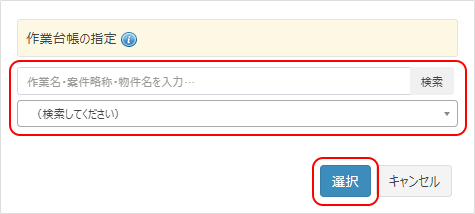 ③作業台帳の指定画面が表示されます。入力フォームに作業名・案件略称・物件名を入力すると該当する作業台帳を選択可能となりますので、作業台帳を選択して「選択」ボタンをクリックします。①で選択された作業票に対してここで選択された作業台帳が指定されます。 ※作業台帳の指定は即時反映されます。「選択」ボタンクリック後の変更・解除はできませんのでご注意ください。 |