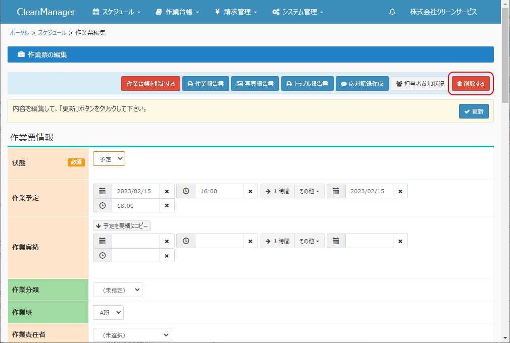 ①カレンダー画面、もしくは作業票一覧画面から削除したい作業票画面を開きます。