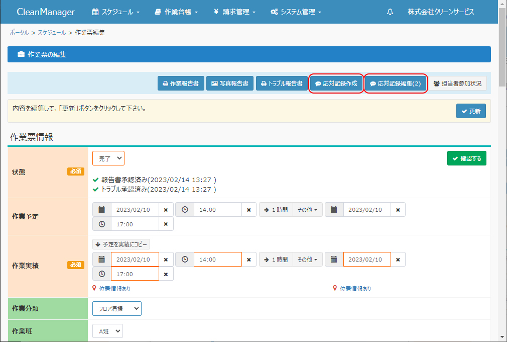 作業票に対して応対記録を登録、もしくは登録済みの応対記録の内容を更新します。応対記録の登録または更新を行う方法は、登録済み作業票の作業票編集画面から行う方法とスケジュール詳細画面から行う方法の2種類があります。