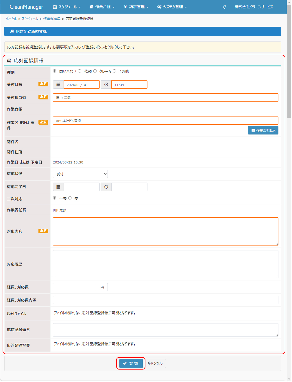 ③ ②での操作に応じて応対記録情報の新規登録画面もしくは応対記録編集画面が表示されます。任意の項目の内容を編集し、「登録」もしくは「更新」ボタンをクリックします。