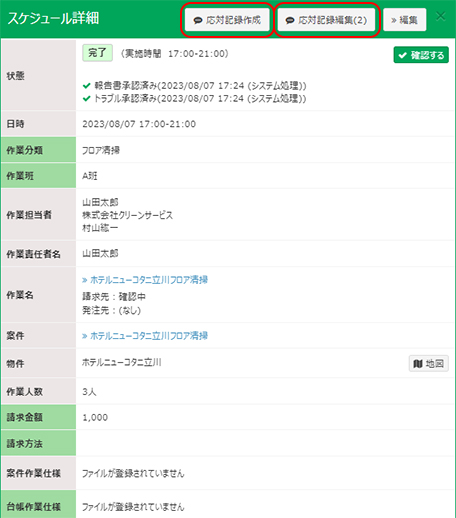 作業票に1つ応対記録が登録済の場合→「応対記録作成」ボタン、「応対記録編集」ボタンが表示