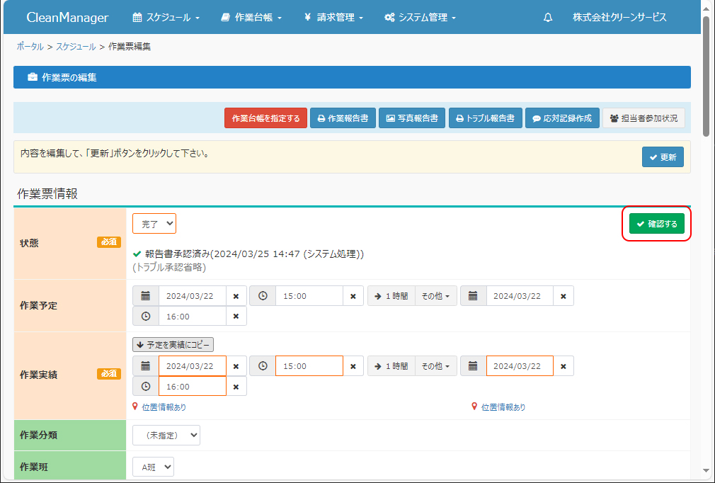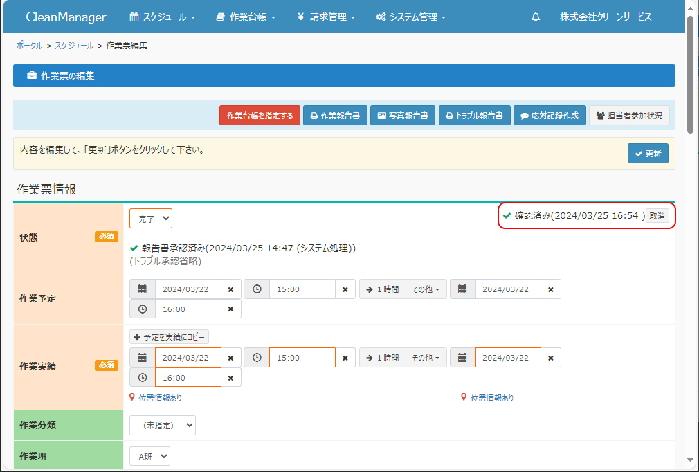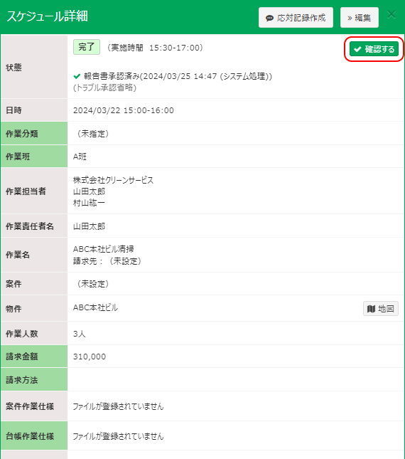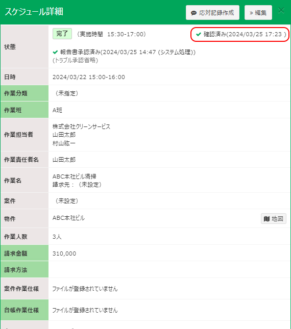 ③確認済み状態となり確認した日時が表示されます。 ※スケジュール詳細画面では「取消」ボタンは表示されません。確認状態を取り消す場合には作業票編集画面から行なってください。 ※確認済み状態は「確認する」ボタンをクリックした時点で反映されます。 |