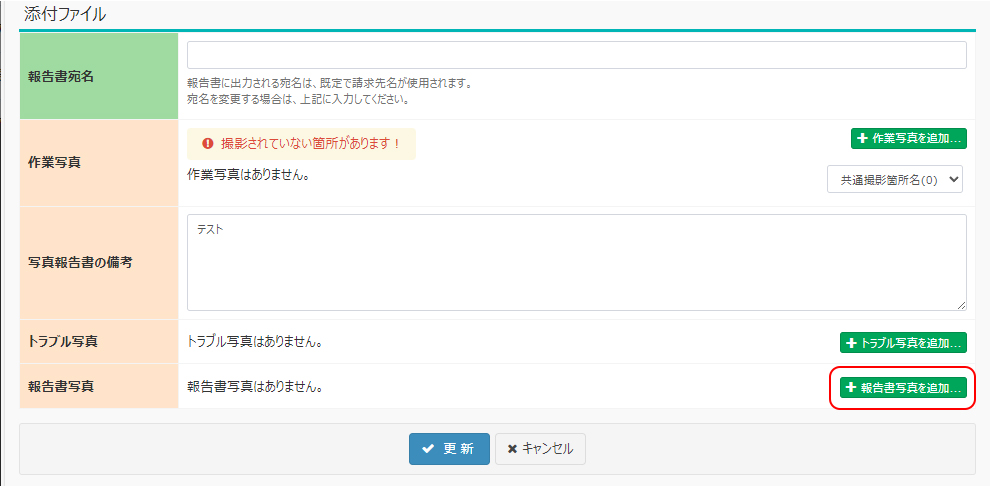 ※「報告書写真を追加」ボタンは案件の登録時、ならびに作業台帳の登録時に報告書撮影機能を使用する設定になっている作業の場合のみ表示されます。また、案件側と作業台帳側で異なる設定がされている場合(案件側で「使用する」が選択され、作業台帳側で「使用しない」と設定されている場合等)は作業台帳側の設定が優先されます。