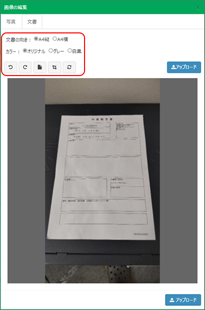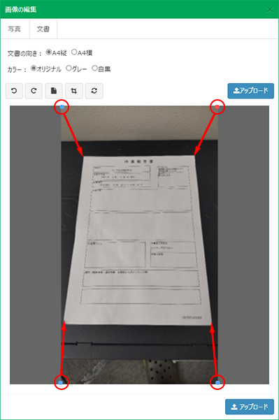 作業票の編集時に報告書写真をアップロードする際に画像の台形補正(傾き補正)を行うことができます。