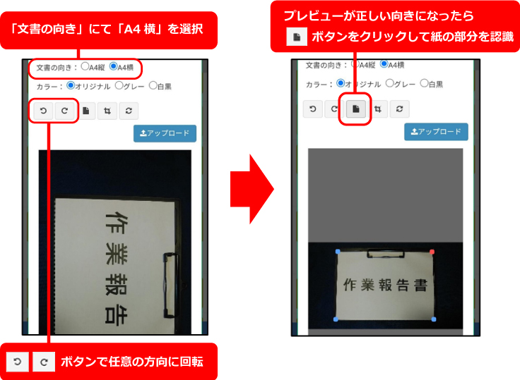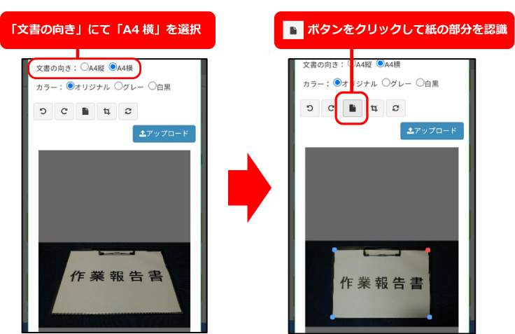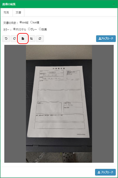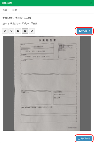 ⑥画像が補正されます。問題がなければ「アップロード」ボタンをクリックして報告書写真をアップロードしてください。 |