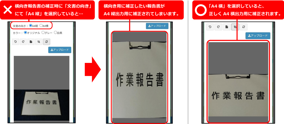 文書の向き:画像の中で、報告書が「縦」「横」どちらで写っているかを指定します。この選択は、画像補正実行時の縦横判定に使用されます。