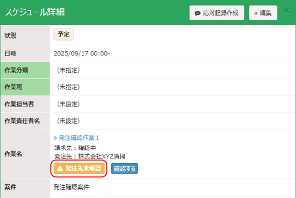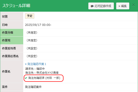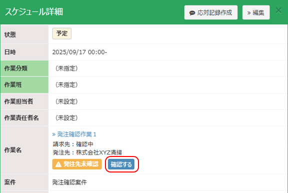 発注先による確認 発注先のユーザーのうち、ユーザーマスタにてシステム管理者または管理者として指定されているユーザー、ならびに作業票にて作業責任者または作業担当者として指定されているユーザーが当該作業票のスケジュール詳細画面を表示した際に、「確認する」ボタンが表示されます。「確認する」ボタンをクリックすると、当該作業票が「発注先確認済」状態となります。 ※「確認する」ボタンのクリック後、取消を行うことは出来ません。ただし、以下のような操作が行われた場合、「発注先未確認」の状態に戻る場合があります。