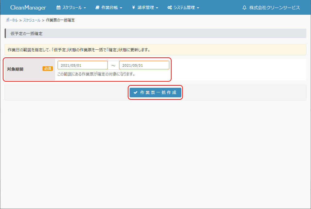 ②仮予定の一括確定画面が表示されます。作業予定を作成する期間を指定し、「作業票一括作成」ボタンをクリックします。