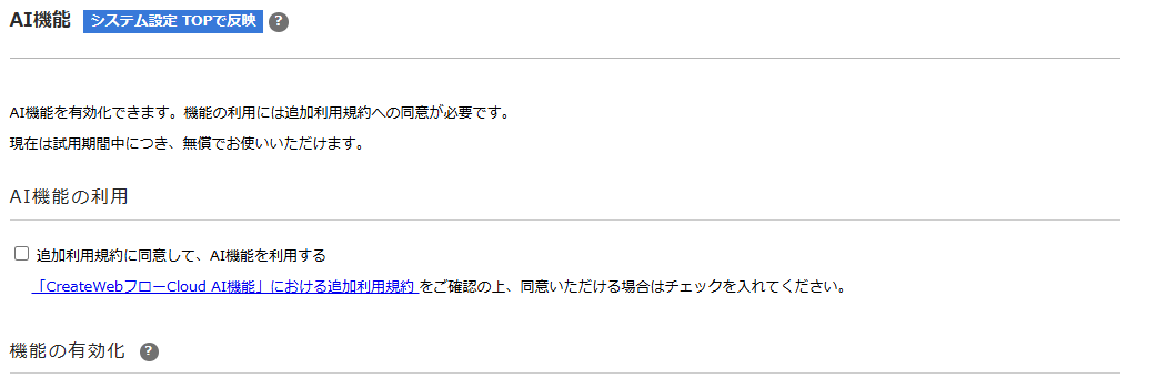 AIに関する機能の設定を行います。機能の利用には 追加利用規約 への同意が必要です。