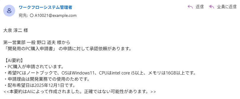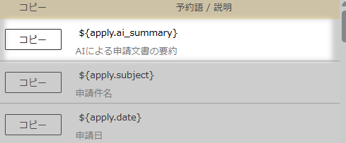 | 申請文書の要約 | 申請文書の要約機能を有効/無効に設定します。 メールに予約語を設定すると申請文書の要約が表示されます。 機能が無効になっているなど、申請時に要約が作成されていない場合には空行が表示されます。