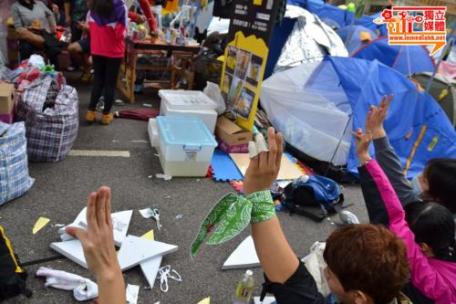 昨晚(11月30日)學聯及學民思潮宣佈行動升級,號召包圍政府總部,與警方爆發衝突,多人受傷。佔領者德仔、Grace、Carol和阿悅一直堅守至今日,中午接受訪問時,正在用軟墊製作防護裝備。