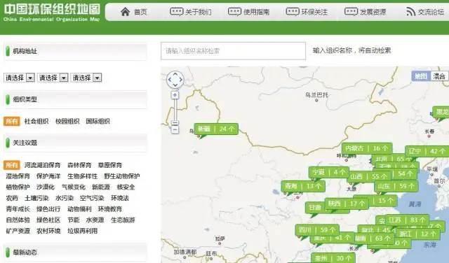 中国环保组织地图的是一个在线工具,便于全国的公众通过网络访问、检索。这个工具以地图的形式集中展示了环保组织信息,可根据地域、工作议题、名称等进行检索。主地图可以进行缩放,细化看到某个省份、城市、区县的环保组织,进而点击具体了解到某一家感兴趣的环保组织的具体信息。