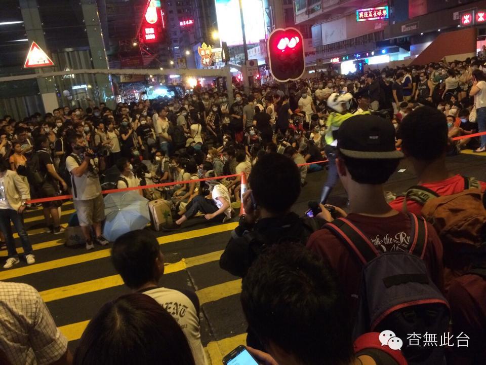 29日 0:11 数百名市民集结旺角弥敦道,有示威者冲出车道于十字路口静坐。