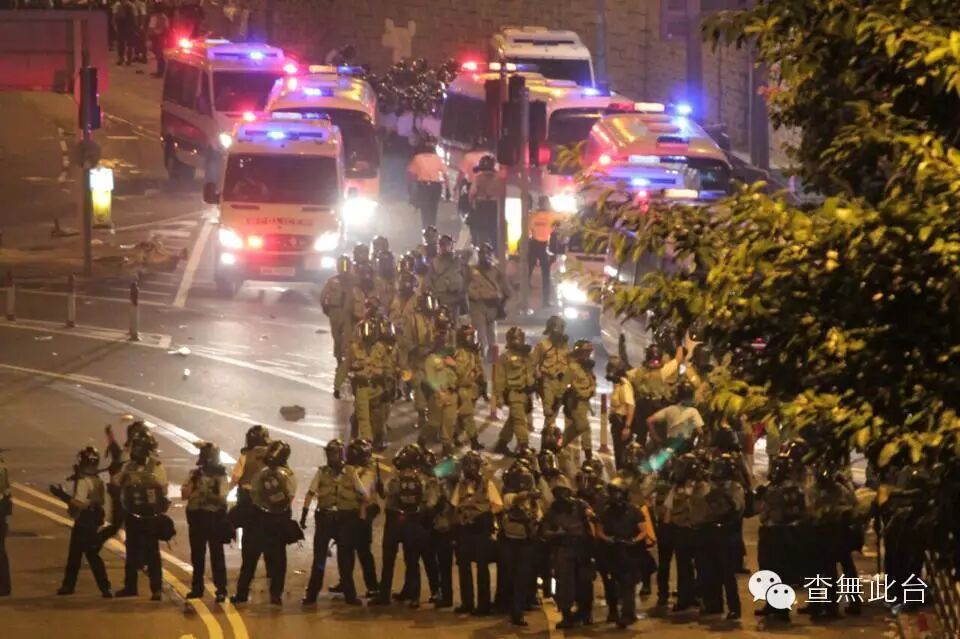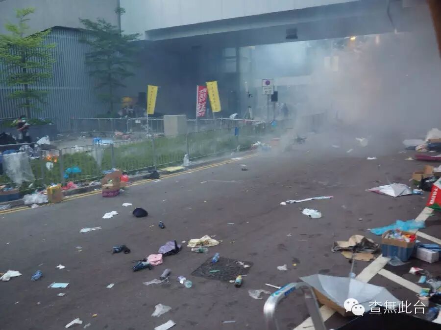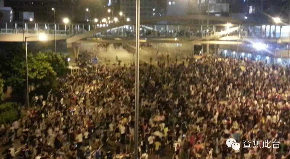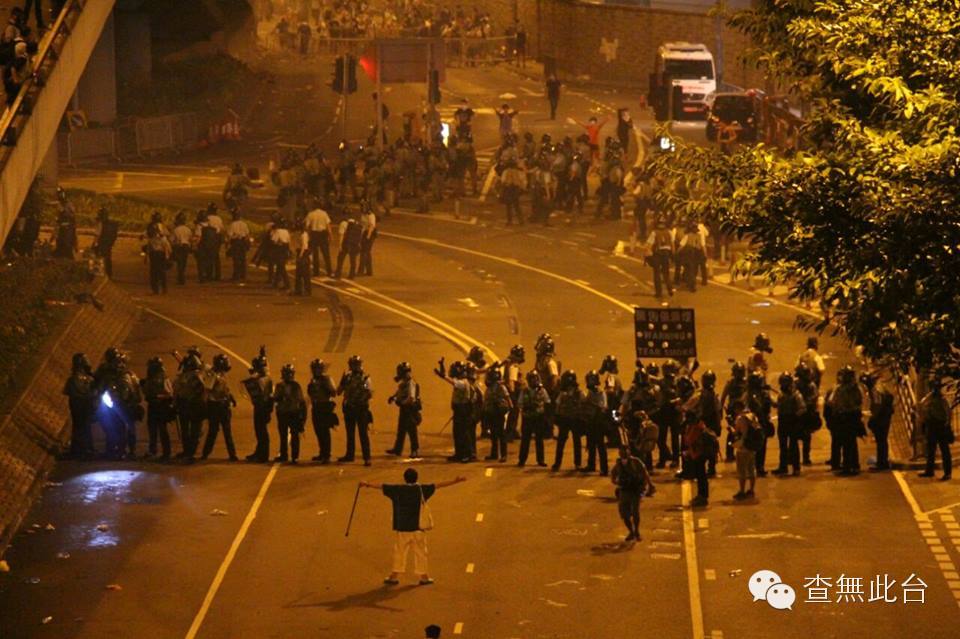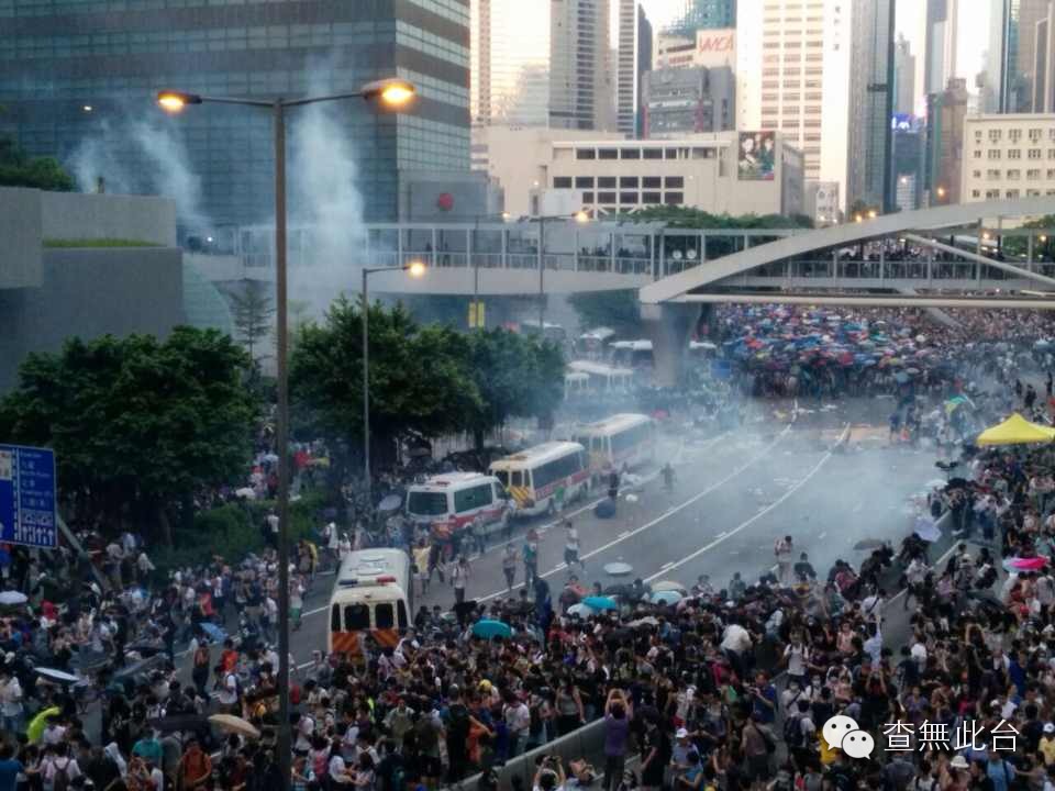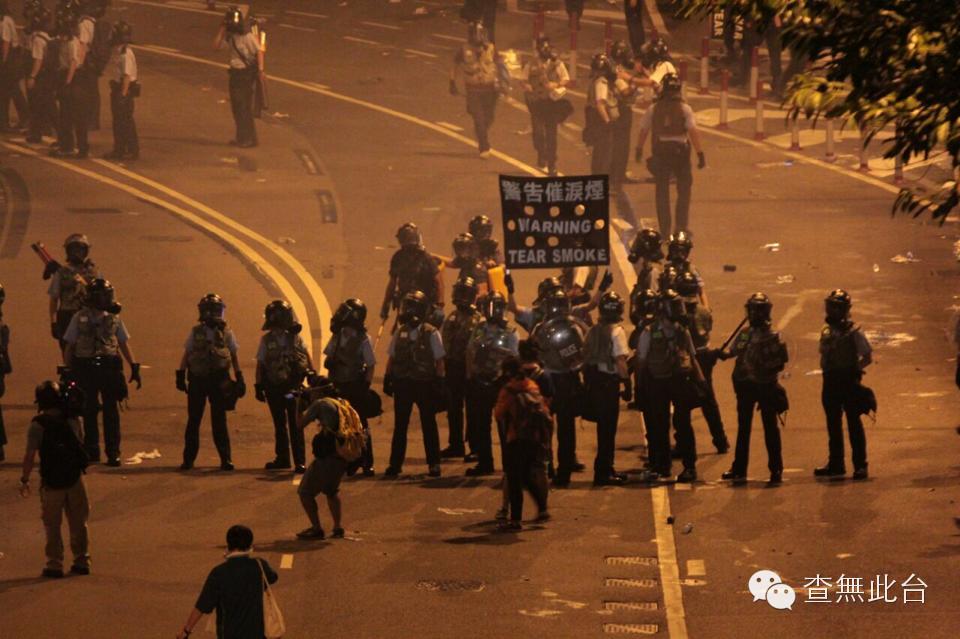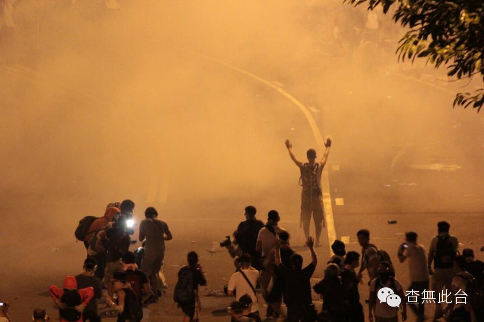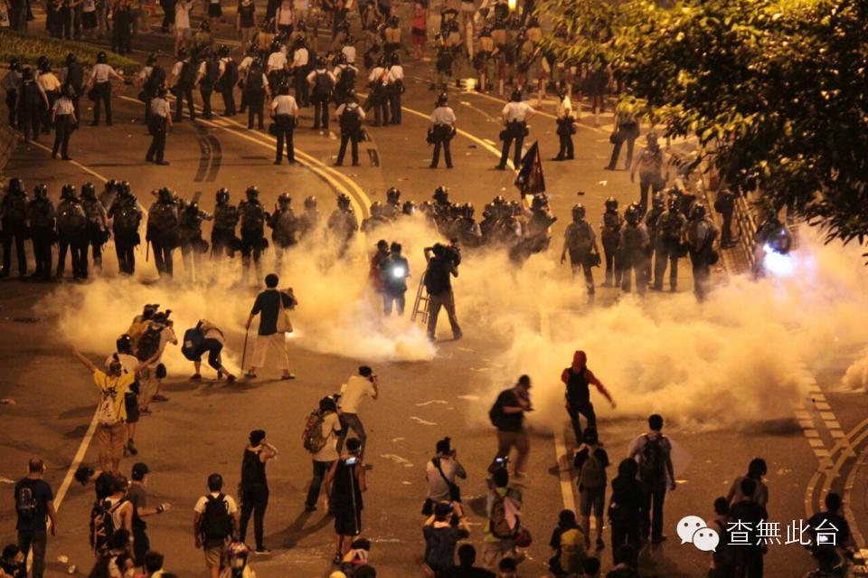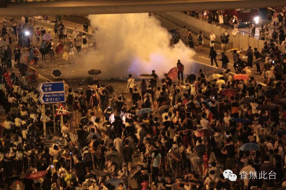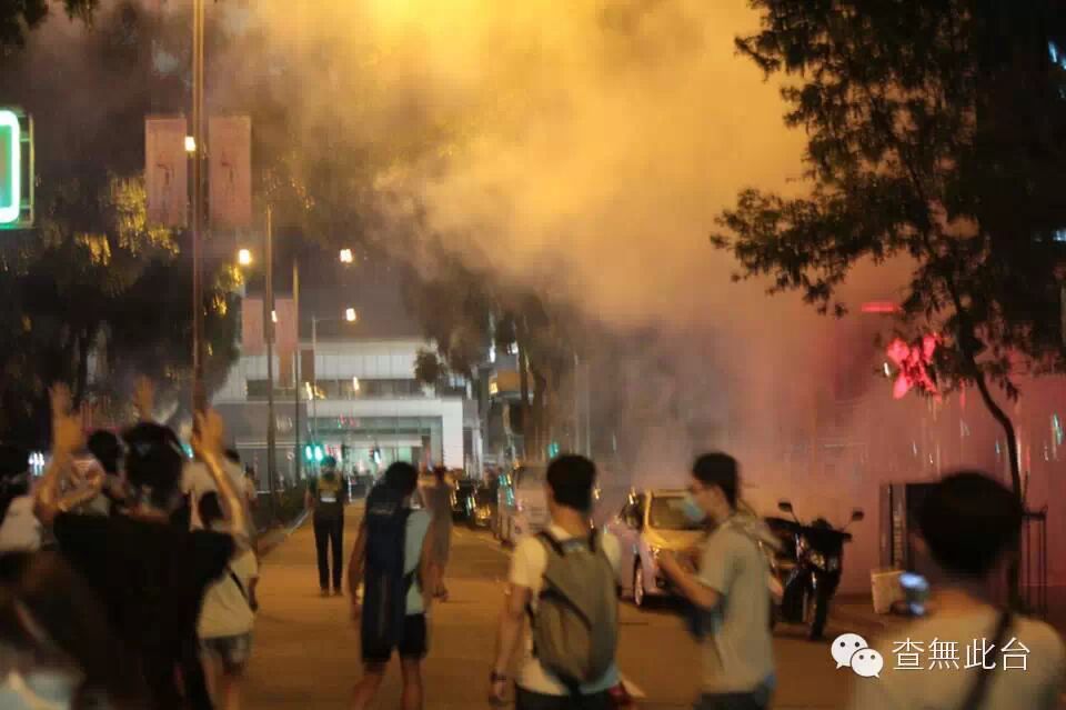 1:01 于解放军驻港办事处外,警方多次施放催泪弹,有市民跪在防暴警察前,而有现场市民表示,警方在第一次施放催泪弹前没有出示警告。