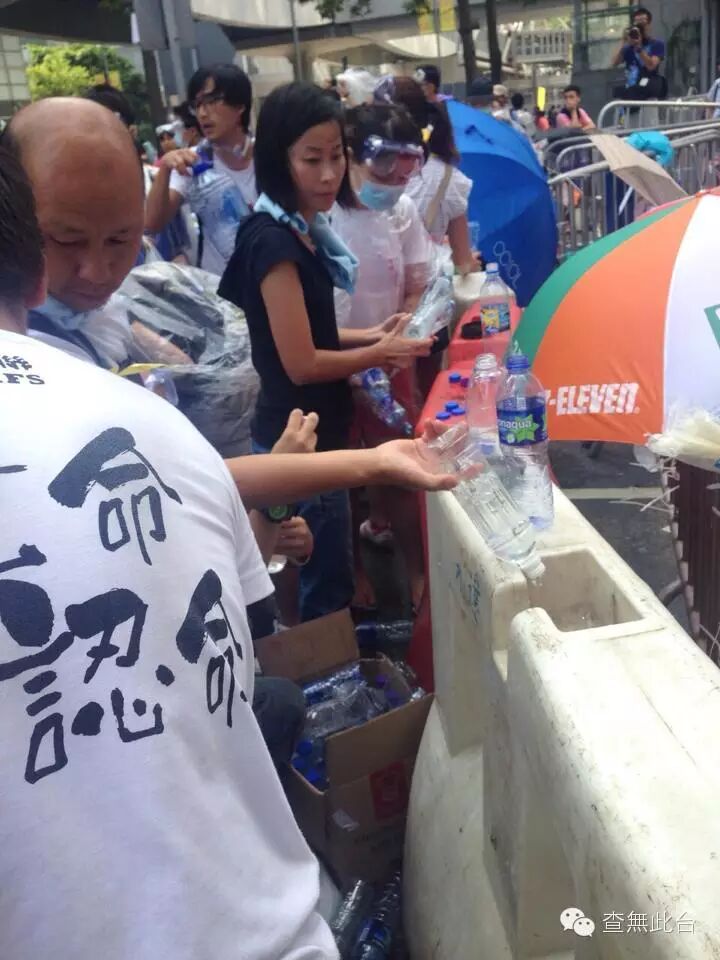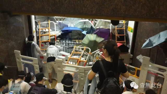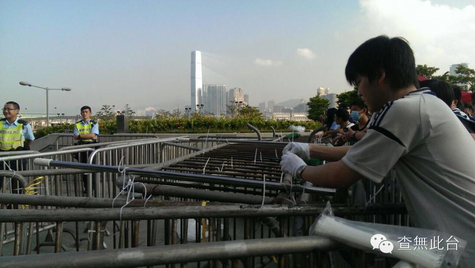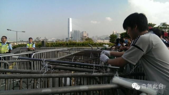 1:52 和平佔中所有物资陆续搬入政总会场,纠察队、义工进驻会场,并整理铁马筑造工事。