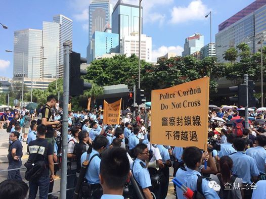 13:56 警方封锁往演艺学院天桥,并组成三道防线。桥上约有500人,有市民陆续越过警方防线,爬上警察总部对出天桥,要求警方放行。部分市民则转往天域街天桥。