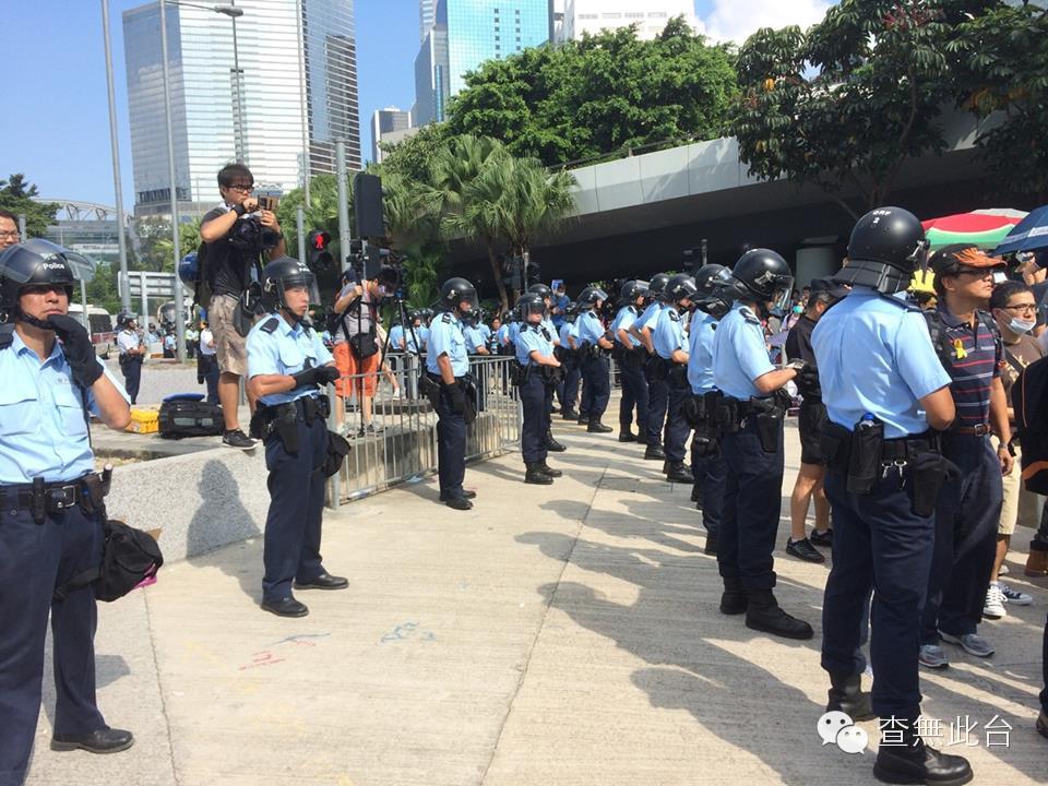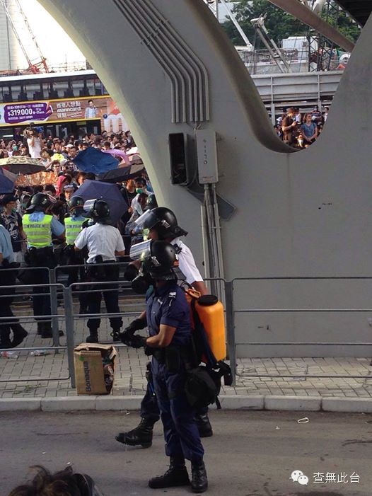 15:43 海富中心附近,警方派出四辆警车到场,警员亦全部戴上头盔,手持胡椒喷雾,准备清场。
