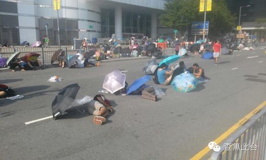 8:56 公民广场对出、龙汇道、政总停车场附近,示威者防线松散,多用伞遮光,席地而眠。