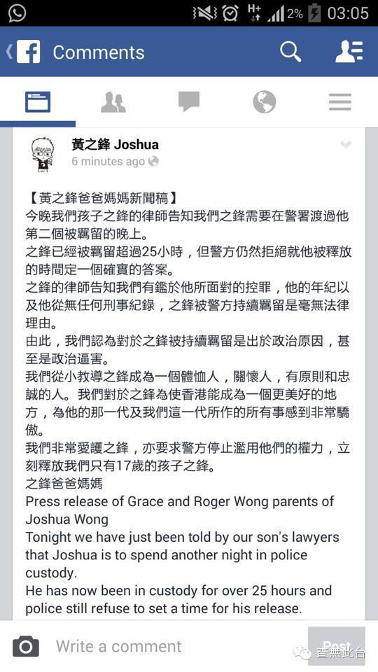 3:14 黄之锋被羁留超过25小时,其家人于凌晨发出新闻稿,批评警方仍拒绝处理之锋的保释申请,及交代释放时间,认为持续羁留是出于政治原因,甚至是政治迫害。又要求警方停止滥用权力,立刻释放17岁的之锋。