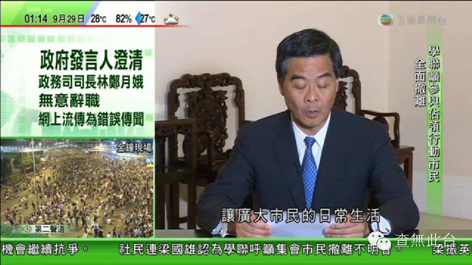 1:36 梁振英就“占领中环”向全港市民讲话,表示无意出动解放军及警方开枪。