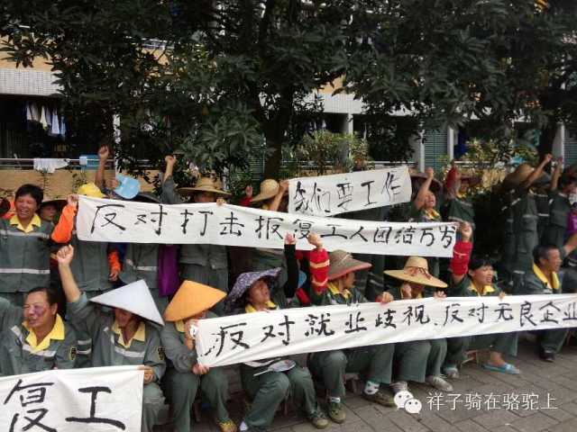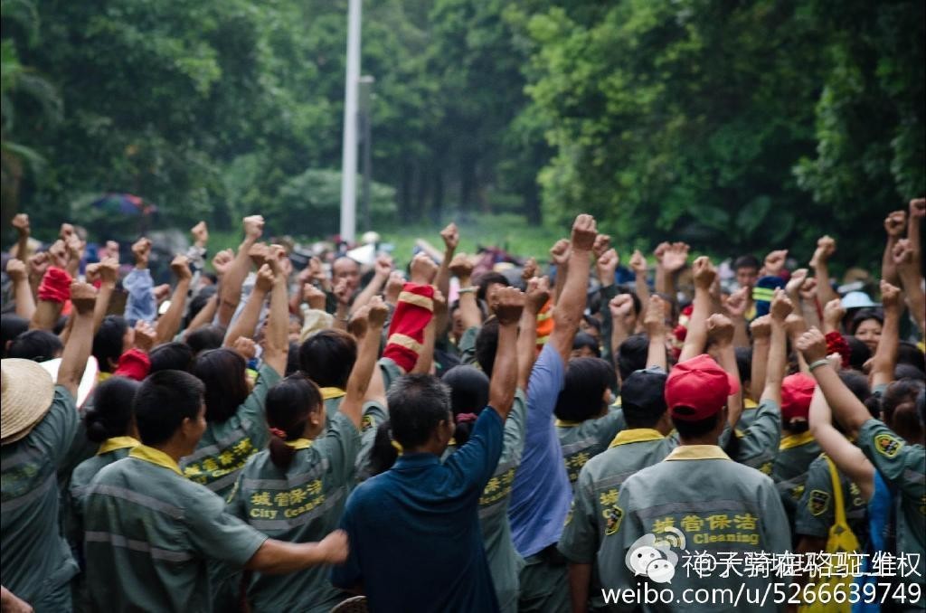 9月12日,要求全体复工抗争第三天。今天一整天仍然有150多位工人继续坚守大学城新天地抗争,捍卫集体利益。所有环卫工都很清楚,如果被公司开除掉四五十个工人,那么继续增加的工作量将加到本地的工人身上,未来工人的权益受损将是必然的结局。所以,绝大多数环卫工继续要求全体复工!同日下午四点半左右,全体工人们来到小谷围街道办,爱卫办工作人员从后门准备溜走,被工人们发现并截住要说法,爱卫办不得已叫来隧成公司女经理,迫于工人团结的压力,经理被迫答应接受全部工人,工人将于明日8点签入职表!广州大学城环卫工集体行动再次取得胜利!