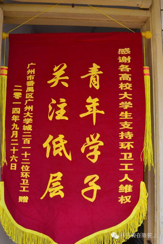 “我们全体大学城环卫工深深感谢所有支持过我们的大学生,没有你们一直的关注和支持就没有我们今日的维权成功。种种原因,我们没能亲自把这感谢的锦旗送给你们,但你们用签名联署、送水、捐款,甚至现场带我们唱歌鼓劲这些行动,鼓舞了我们维权坚持到底的信心!